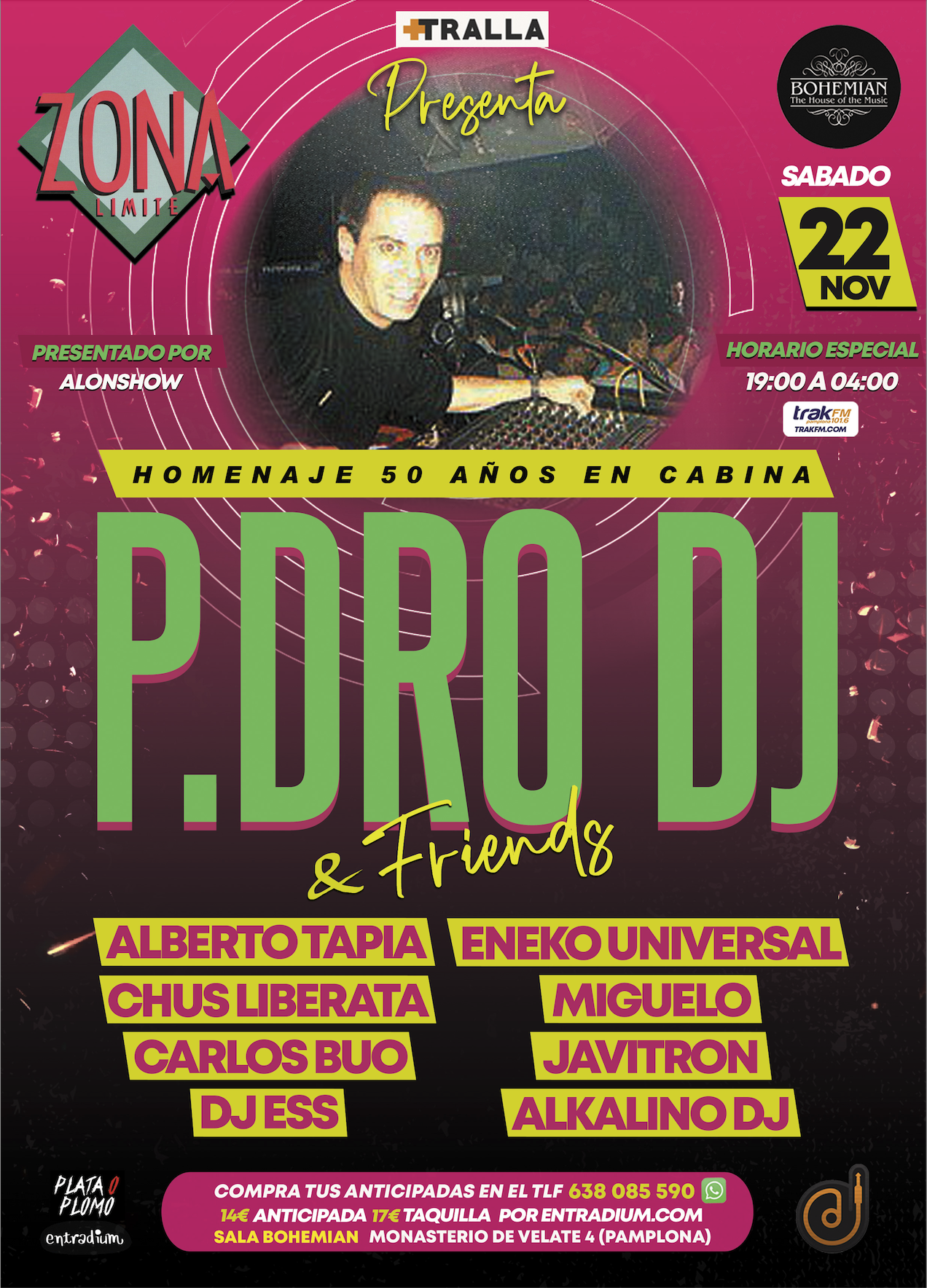 La Sala Bohemian (Pamplona) acogerá el sábado 22 de noviembre de 2025, entre las 19:00 y las 04:00, “P.Dro & Friends”, un evento-homenaje que celebra medio siglo de carrera de uno de los DJs más influyentes del norte peninsular. La cita rinde tributo a una trayectoria inseparable de nombres como Rodas, Límite y, sobre todo, Zona Límite, auténtica catedral del ritmo para varias generaciones cuando el Eurodance, el House y el Progressive marcaron una época.